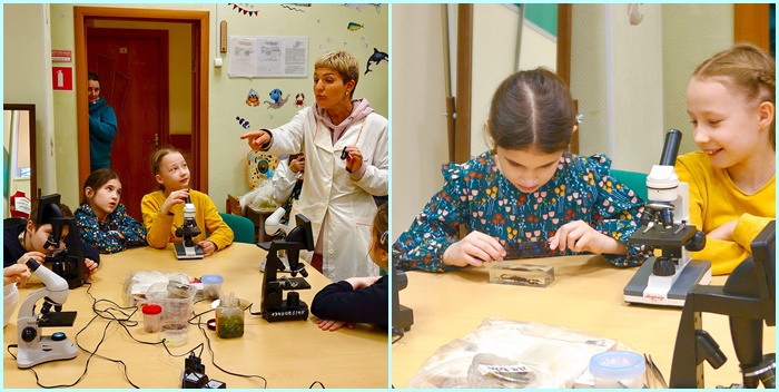 На занятии ребята познакомились с историей праздника, вспомнили выдающихся учёных, которые повлияли на развитие мировой науки и историю мира. А далее приступили к практике - с интересом рассмотрели под микроскопом крыло бабочки, ротовой аппарат комара, а самым лакомым кусочком была капля из аквариума, где активно сновали различные микроскопические существа и даже кольчатый червь эолосома, которому ребята даже придумали имя.