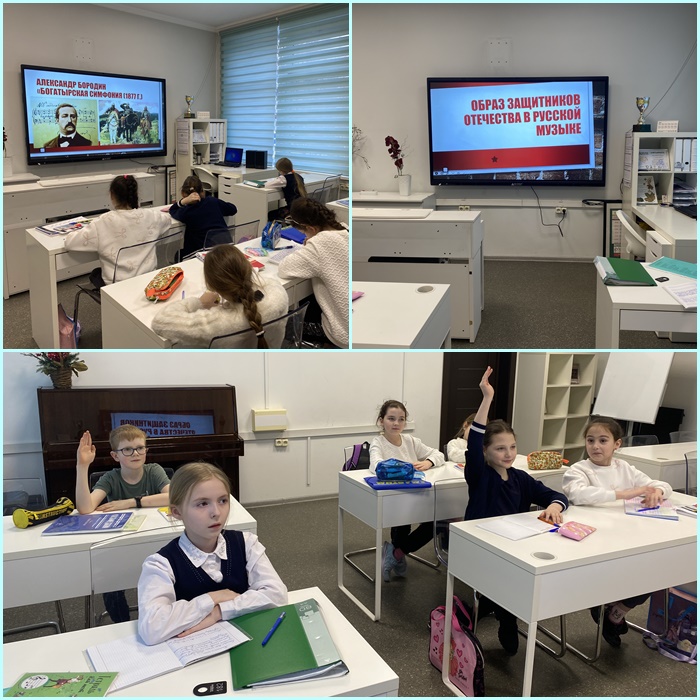 Ребята познакомились с шедеврами русской классики, посвященных героизму и мужеству защитников Отечества. Педагог рассказала об истории создания «Богатырской симфонии» Бородина, кантате «Александр Невский» С. Прокофьева и «Ленинградской симфонии» Д. Шостаковича.