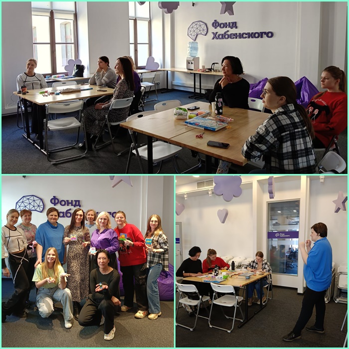 В этот раз педагог Юлия Лапшинова провела обучающий семинар для волонтеров «Фонда Хабенского», которые проводят творческие мастер-классы для пациентов Морозовской детской городской больницы по развитию мелкой моторики рук.
