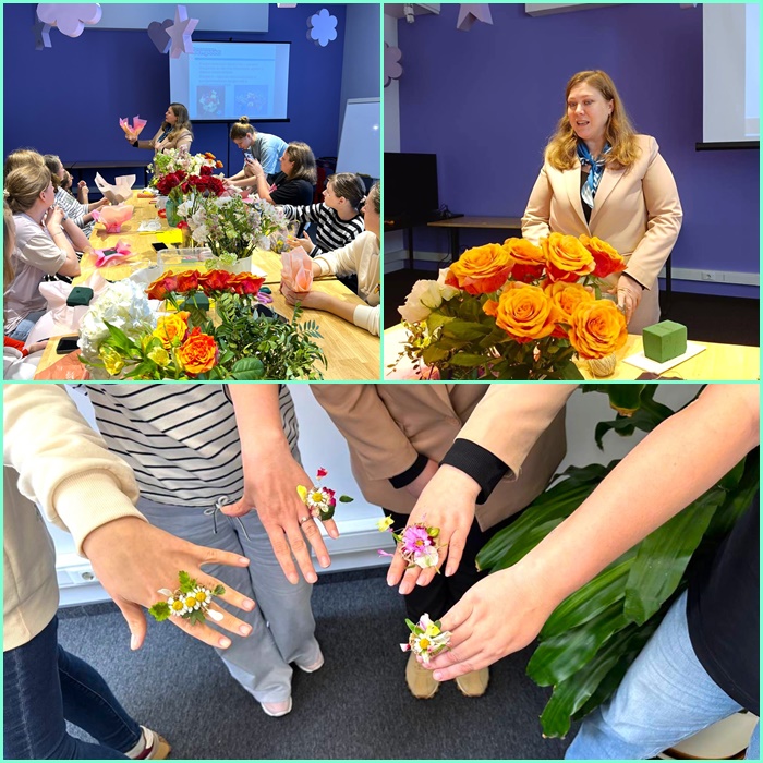 Участники собирали композиции «Весенняя фантазия» из сезонных срезанных цветов на неорганической основе (пиафлоре). В процессе работы они познакомились с основными принципами построения цветочной композиции, базовыми правилами сочетания цвета и фактуры, секретами гармоничного сочетания оттенков и форм.