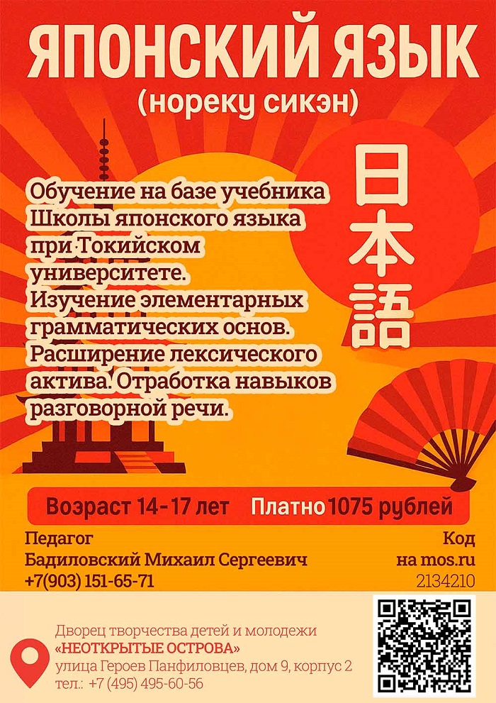 Обучение проходит на базе учебника Школы японского языка при Токийском университете. Ребята выучат элементарные грамматические основы, расширят словарный запас и отработают навыки разговорной речи.