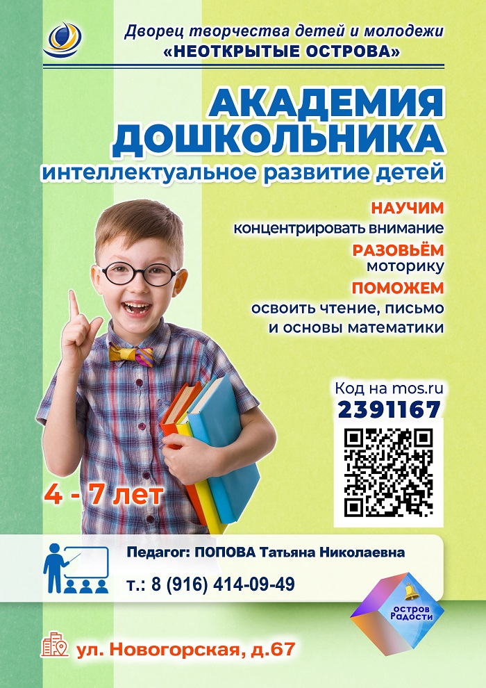 «Академия дошкольника» на ул. Новогорская, 67, приглашает мальчишек и девчонок 4-7 лет. Что будем делать? Научим концентрировать внимание, разовьем моторику, поможем освоить чтение, письмо, основы математики.