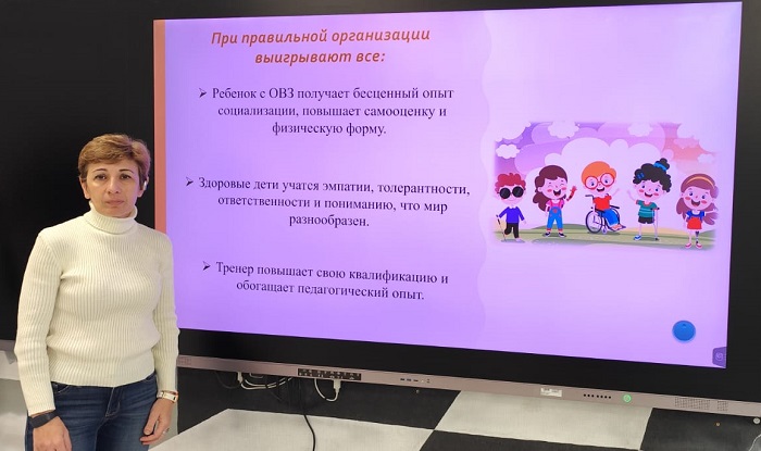 Она отметила, что работа с детьми с ОВЗ в спорте требует особой квалификации и регламентируется строгими правилами. Почему же недостаточно просто диплома «Физкультура и спорт»? Тренер по АФК (адаптивная физическая культура) обладает специализированными знаниями: знание нозологий (особенностей заболеваний и нарушений: ДЦП, РАС, нарушения слуха, зрения, интеллекта и т.д.), методики адаптации физических упражнений под возможности ребенка, основы медицинских знаний и противопоказания, особенности психологии детей с ОВЗ, владение техниками реабилитации и социальной интеграции через спорт. Мария Ашотовна особо отметила, что интеграция ребенка с ограниченными возможностями здоровья в группу здоровых сверстников на спортивных занятиях — это сложный, но мощный инструмент социализации и развития, что ключевая цель интеграции в спорте - не просто «посещать одну группу», а стать частью команды, участвовать в тренировочном процессе наравне с другими, в доступной для ребенка форме, получая пользу и удовольствие. И особо важно - формировать атмосферу принятия и поддержки занятиях, объяснять, что все люди разные, но каждый ценен.
