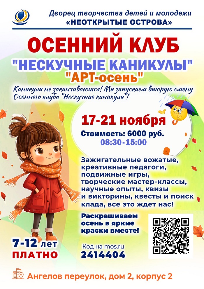 Для тех, у кого каникулы с 17 по 21 ноября, на «Ангеловом острове» с 08:30 до 15:00 педагоги подготовили мастер-классы, научные опыты, квизы и другие интересные активности. Скореей записывайтесь! Код для записи на mos.ru: 2414404.